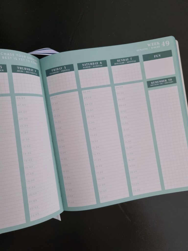 Het is een planner voor school eigenlijk (er zijn pagina’s voor examenplanningen en projecten), maar goed, dat maakt me helemaal niet uit. Wat het ‘m voor mij deed was uiteraard de mooie vormgeving (kleurtjes!), maar ook de indeling. Een week is namelijk verdeeld over twee pagina’s en elke dag heeft een uurindeling.
