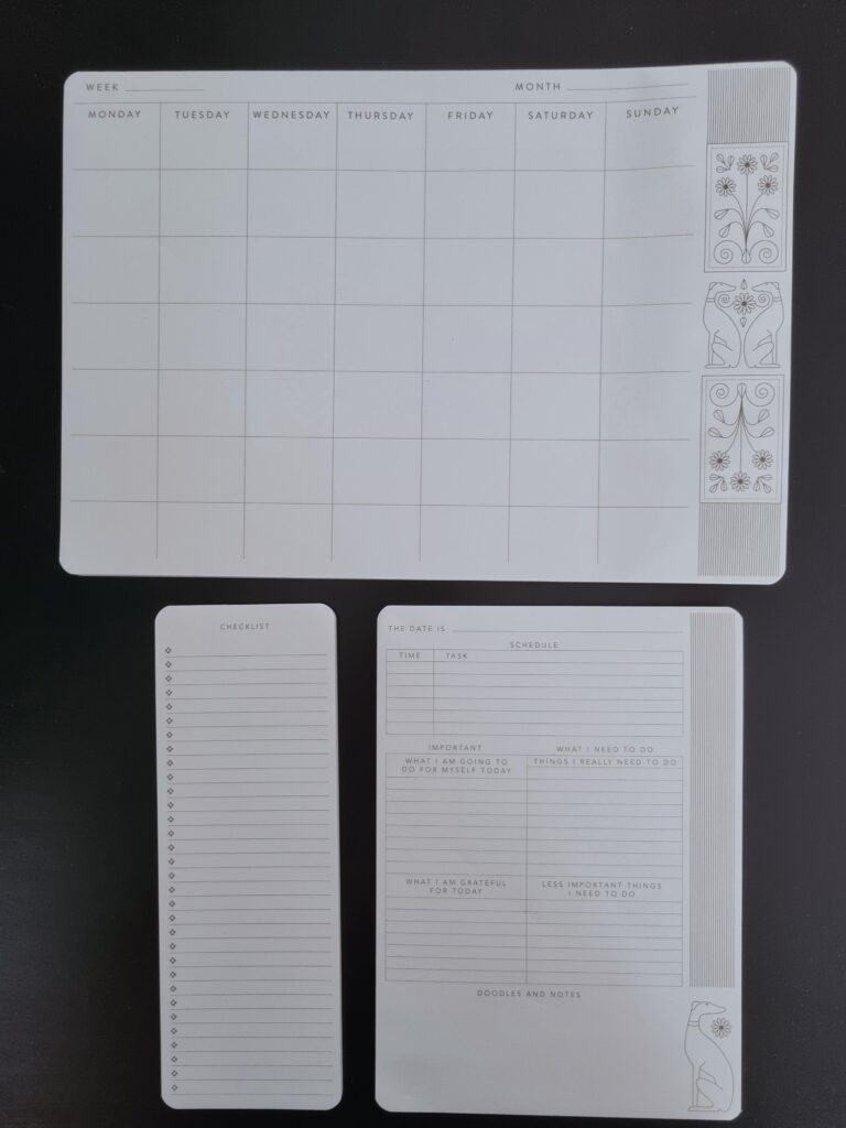 Dan zag ik iets wat ik eigenlijk toch nodig had, maar het pas besefte toen ik het zag liggen (hehe): een maandplanner. Ik gebruik dat om hier een beetje overzicht te bewaren en het kalendertje van de Flow dat ik gebruikte, vond ik echt veel te klein. De planner zat in een setje met een lijstjesblokje en een blokje met blaadjes voor je dagelijkse planning. Of ik dat laatste veel ga gebruiken weet ik niet. Het is een nogal uit de kluiten gewassen set, vind ik. Er zitten echt veel vellen op zo’n blok.