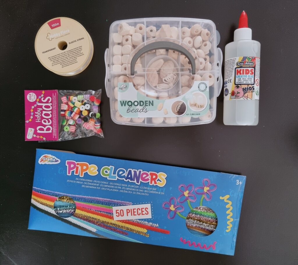 Voor de kleine bracht ik wat knutselspulletjes mee. Hij is nu helemaal into armbandjes maken, knippen en plakken. We hebben de regel in huis dat we geen nieuw speelgoed kopen tenzij hij zelf een centje heeft gekregen bij een bepaalde gelegenheid, maar voor knutselgerief maak ik graag een uitzondering. Ik kocht: